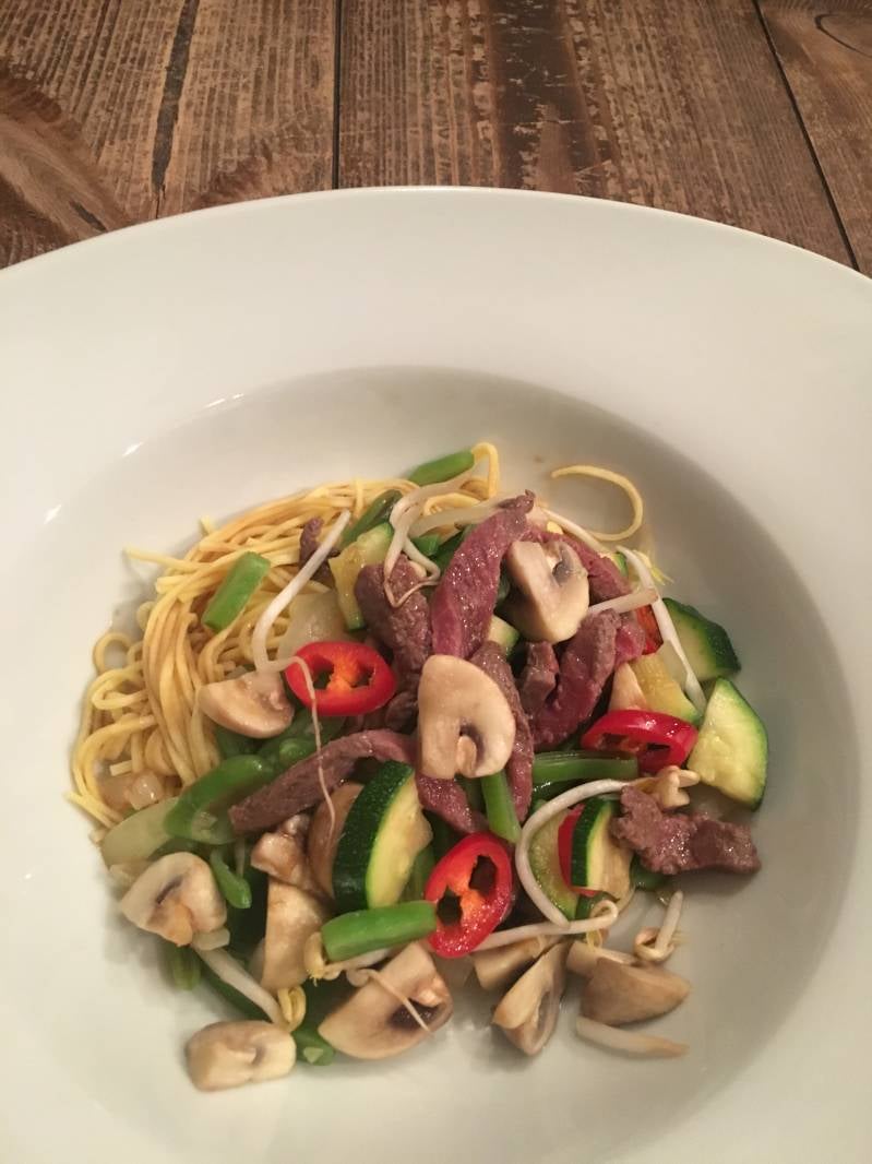 - Voeg de afgegoten noodles toe, laat het even opwarmen en maak het geheel op smaak met sojasaus en sambal.
